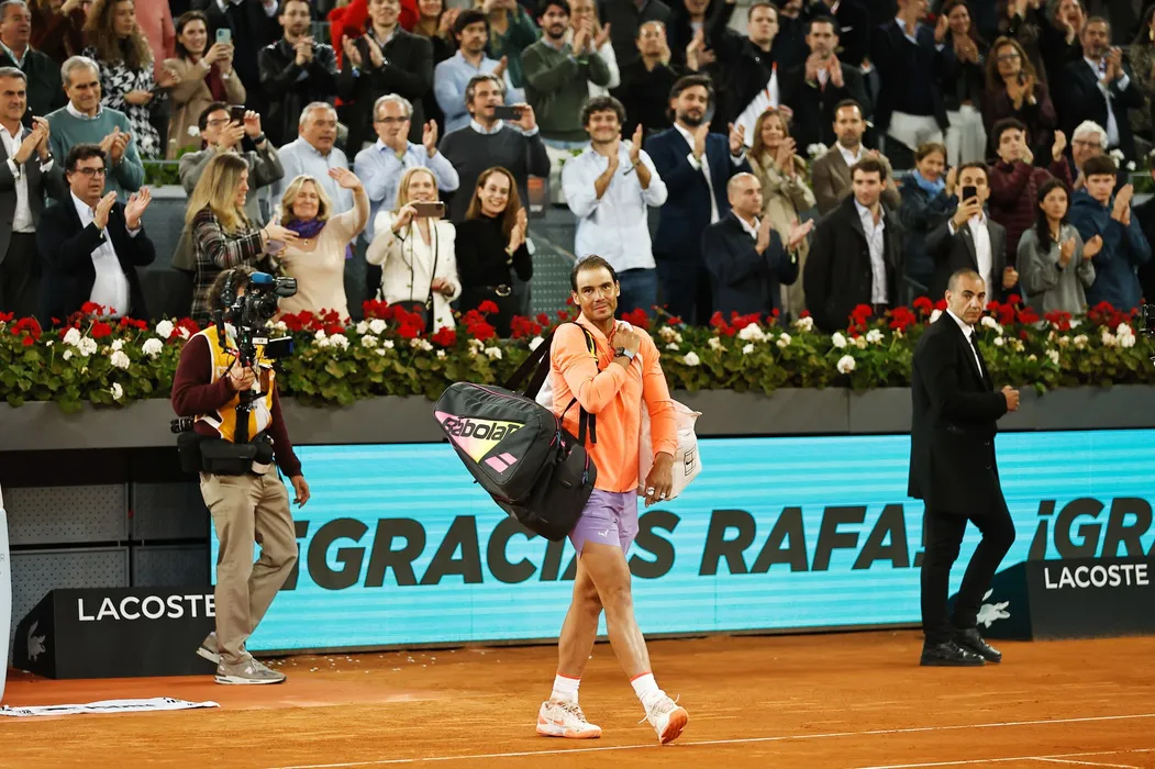 Rafael Nadal (ESP), APRIL 30, 2024 - Tennis : Rafael Nadal responds to cheers at the goodbye ceremony after the lossing singles round of 16 match against Jiri Lehecka on the ATP tour Masters 1000 "Mutua Madrid Open tennis tournament" at the Caja Magica in Madrid, Spain. (Photo by Mutsu Kawamori/AFLO),Image: 869299229, License: Rights-managed, Restrictions: No third party sales, Model Release: no
