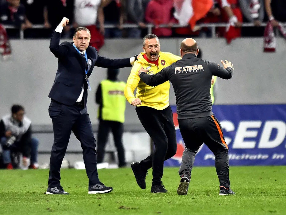 Mihai Stoica si Laurentiu Reghecampf se bucura la finalul meciului de fotbal dintre FCSB si Dinamo Bucuresti, disputat pe National Arena din Bucuresti, in cadrul play off-ului Ligii 1 Orange, duminica 2 aprilie 2017.Razvan Pasarica/ SPORT PICTURES