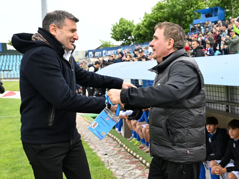 Antrenorii celor doua echipe Gheorghe Hagi si Laszlo Balint se saluta inaintea meciului de fotbal dintre Otelul Galati si Farul Constanta, din cadrul Play off-ului Superligii Superbet, desfasurat pe Stadionul Otelul din Galati, vineri 16 mai 2025. © FOTO:Razvan Pasarica/SPORT PICTURES