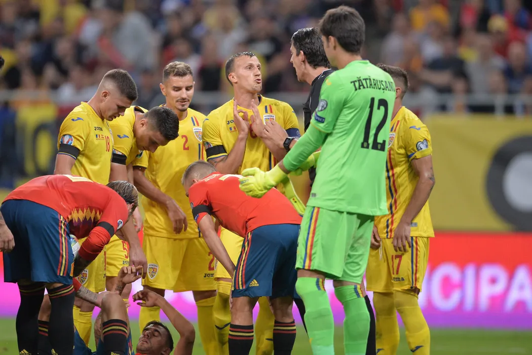 Vlad Chiriches (C), de la nationala de fotbal a Romaniei, discuta cu arbitrul Deniz Aytekin (CD) in timpul meciului contra selectionatei Spaniei din Grupa F a preliminariilor Euro 2020, disputat pe Arena Nationala din Bucuresti, joi, 5 septembrie 2019. ALEXANDRU DOBRE / MEDIAFAX FOTO