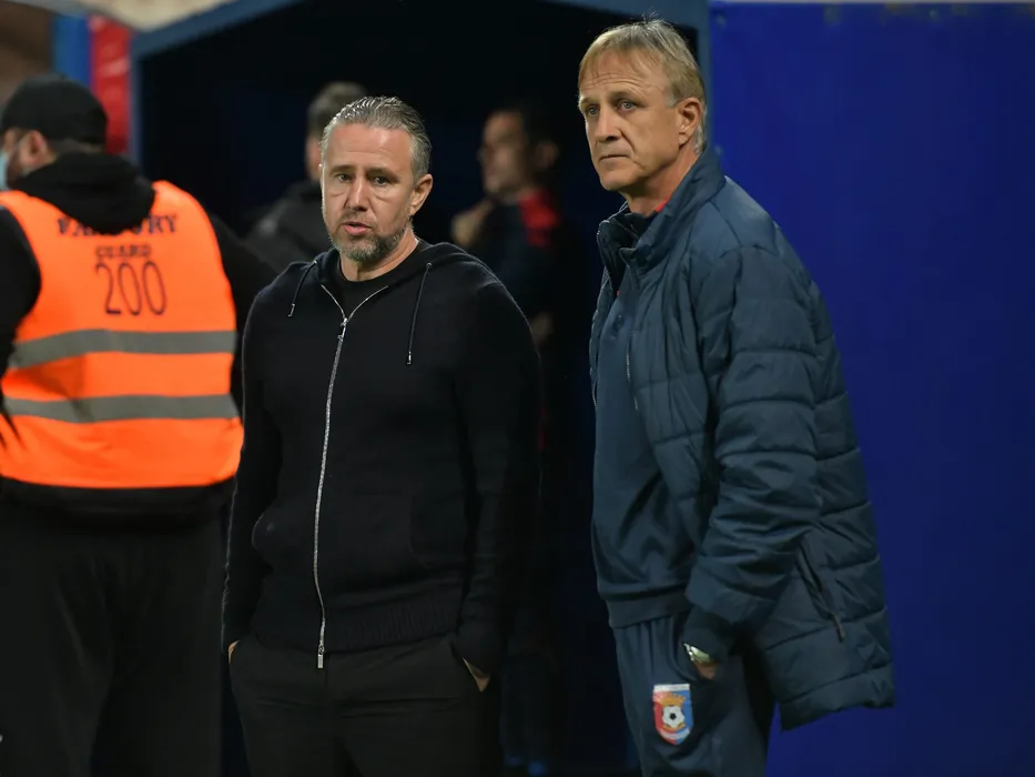Cei doi antrenori Laurentiu Aurelian Reghecampf si Emil Sandoi discuta inaintea meciului de fotbal dintre Chindia Targoviste si Universitatea Craiova, contand pentru Liga 1 Casa Pariurilor, desfasurat pe Stadionul Ilie Oana din Ploiesti, vineri 22 octombrie 2021. © FOTO:Razvan Pasarica/SPORT PICTURES
