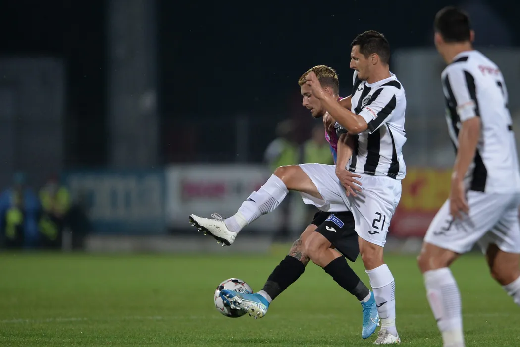 Ljuban Crepulja (D), de la AFC Astra Giurgiu, lupta pentru balon cu Stephan Draghici (S), de la Gaz Metan Medias, in timpul meciului de fotbal din etapa a III-a a play-off-ului Ligii 1, disputat pe stadionul Marin Anastasovici din Giurgiu, luni, 15 iunie 2020. ALEXANDRU DOBRE/ MEDIAFAX FOTO