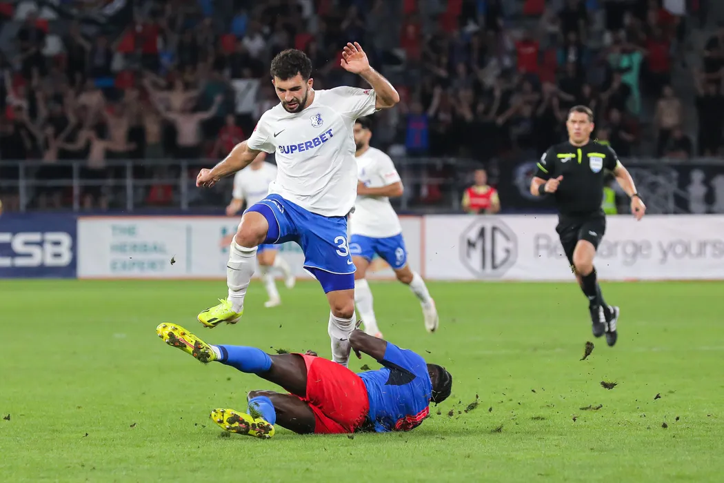 Narek Grigoryan și Joyskim Aurelien Dawa Tchakonte în meciul de fotbal dintre FCSB și Farul Constanța, contând pentru Superliga Superbet, desfășurat pe Stadionul Steaua din București, vineri 9 august 2024. © FOTO: Antonio VASILE/SPORT PICTURES