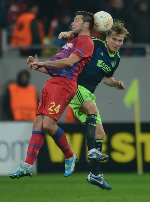 Ajax Amsterdam's Danish midfielder Christian Poulsen (R) vies for the ball with Bucharest's striker Raul Rusescu during the UEFA Europa League Round of 32 football match FC Steaua Bucuresti vs AFC Ajax in Bucharest, Romania on February 21, 2013.,Image: 154257058, License: Rights-managed, Restrictions: , Model Release: no