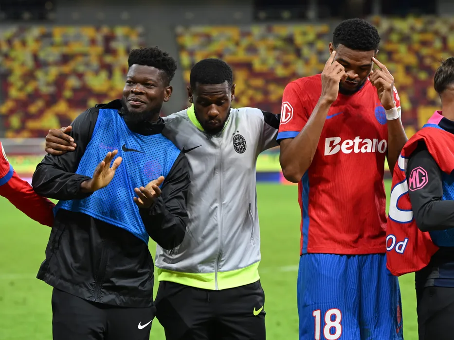 Fotbalistii ros-albastrii Enagnon David Kiki, Mamadou Thiam si Malcolm Sylas Laouari Edjouma saluta galeria dupa meciul dintre FCSB si Otelul Galati, contand pentru Superliga Superbet, desfasurat pe Arena Nationala din Bucuresti, duminica 28 septembrie 2025. © FOTO:Razvan Pasarica/SPORT PICTURES