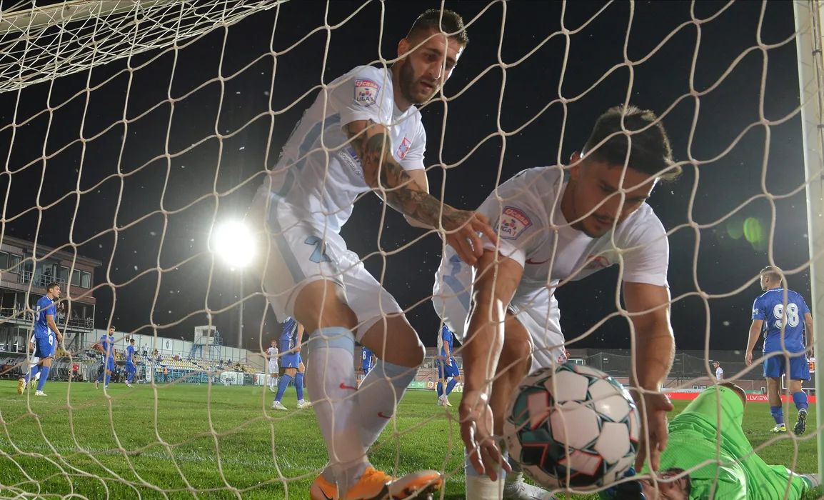 Ovidiu Marian Popescu si Alexandru Daniel Buziuc scot mingea din plasa portii aparate de catre Victor Teodor Ramniceanu dupa un gol reusit in meciul de fotbal dintre FC Voluntari si FCSB, contand pentru Liga 1 Casa Pariurilor, desfasurat fara spectatori pe Stadionul Anghel Iordanescu din Voluntari, sambata 12 septembrie 2020. © FOTO:Razvan Pasarica/SPORT PICTURES