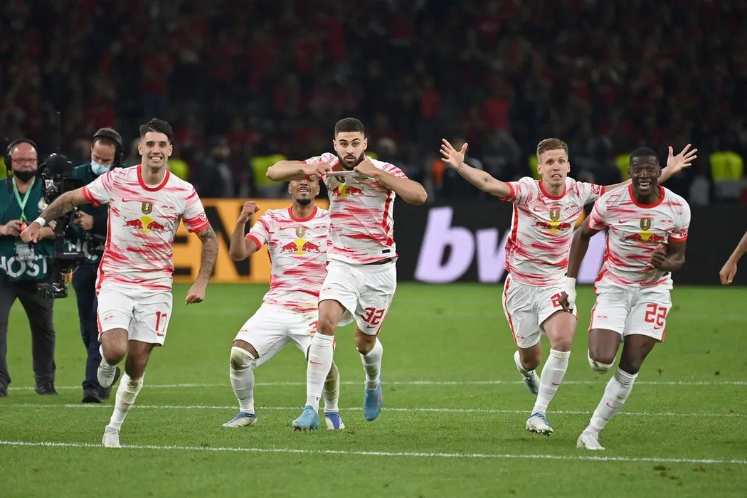 From left: Dominik SZOBOSZLAI (L), Benjamin HENRICHS (L), Josko GVARDIOL (L), Dani OLMO (Leipzig), Nordi MUKIELE (L), jubilation, joy, enthusiasm, action. 79th DFB Cup final, SC Freiburg - RB Leipzig 2-4 iE in the Olympic Stadium in Berlin on May 21, 2022. ##DFL / DFB regulations prohibit any use of photographs as image sequences and/ or quasi-video##,Image: 693447202, License: Rights-managed, Restrictions: GERMANY OUT