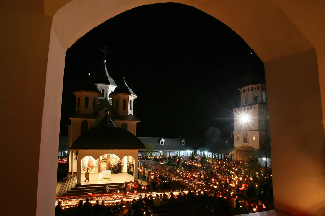Un grup de credinciosi asculta slujba de Inviere, de Sfintele Pasti, la Manastirea Dumbrava, judetul Alba, duminica, 8 aprilie 2007. MIRCEA ROSCA / MEDIAFAX FOTO