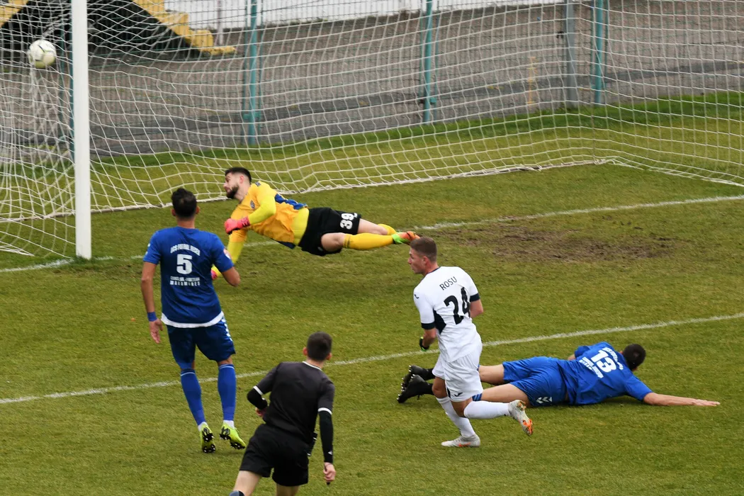 Iulian Rosu marcheaza un gol in poarta lui Dorian Railean in meciul de fotbal dintre SCM Gloria Buzau si ACS Fotbal Comuna Recea, contand pentru Liga a-2-a Casa Pariurilor, desfasurat fara spectatori pe Stadionul Gloria din Buzau, miercuri 18 noiembrie 2020. © FOTO:Adi Berger/SPORT PICTURES