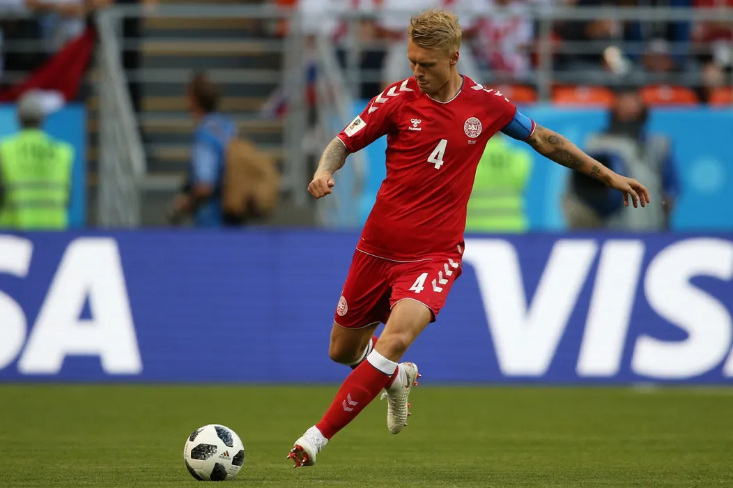 5536032 16.06.2018 Denmark’s Simon Kjaer controls a ball during the World Cup Group C soccer match between Peru and Denmark at the Mordovia Arena in Saransk, Russia, June 16, 2018. Mikhail Serbin / Sputnik/ Hepta / Sport Pictures