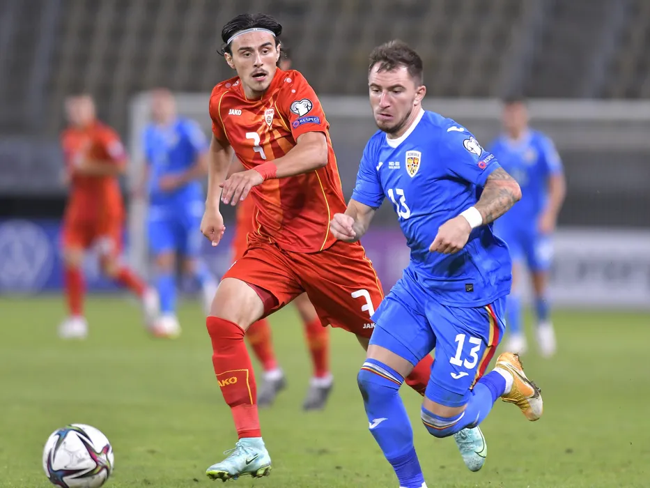 Eljif Elmas si Deian Sorescu in meciul de fotbal dintre Macedonia de Nord si Romania, contand pentru Preliminariile CM 2022, desfasurat pe Arena Nationala Todor Proeski din Skopje, miercuri 8 septembrie 2021. © FOTO:Razvan Pasarica/SPORT PICTURES
