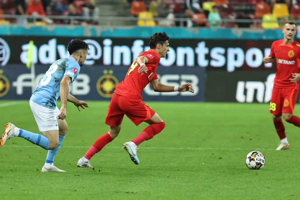 Dorin Rotariu urmărit de Nicolae Carnat în meciul de fotbal dintre FCSB și FC VOLUNTARI, contând pentru SUPERLIGA SUPERBET, desfășurat pe Stadionul Arena Națională din București, duminică 22 octombrie 2023. © FOTO: Gică FLUȘTER/SPORT PICTURES