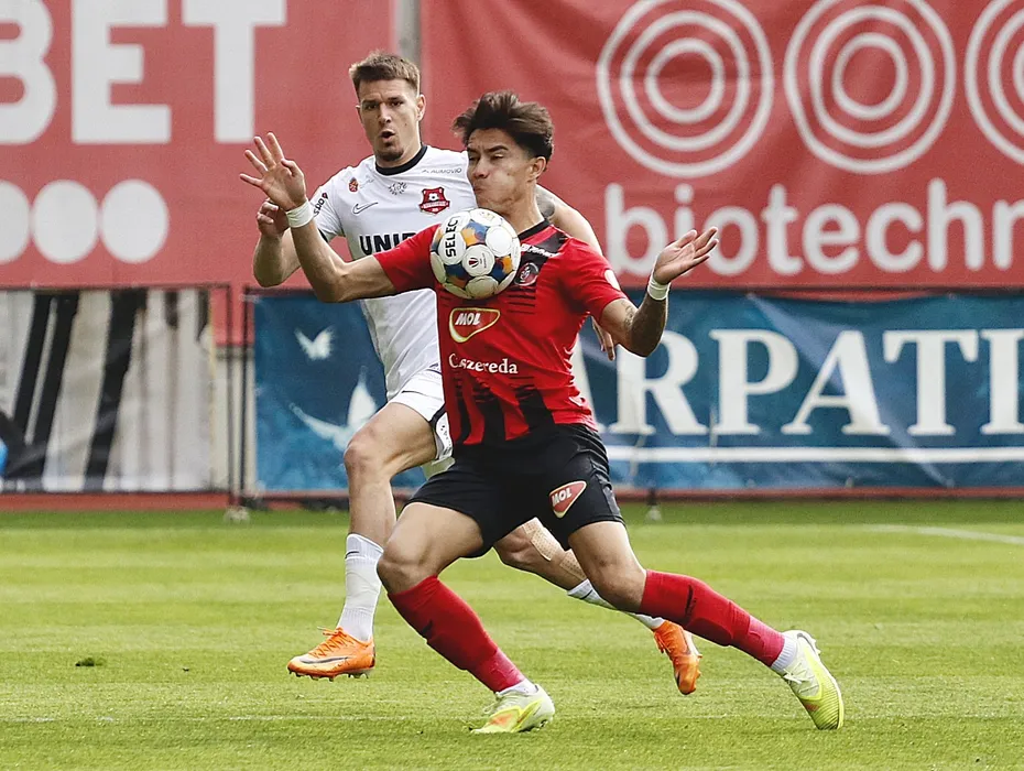 Gustavo Dos Santos Cabral si Tiberiu Ionut Capusa in meciul de fotbal dintre AFC Hermannstadt Sibiu si FK Csikszereda Miercurea Ciuc, contand pentru Superliga Superbet Play-Out, desfasurat pe Stadionul Municipal din Sibiu, vineri 24 aprilie 2026. © FOTO:Valentin Macrea/SPORT PICTURES