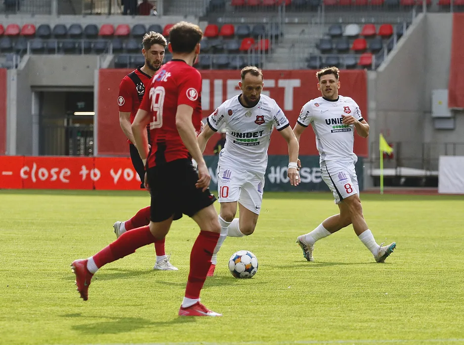 Cristian Daniel Negut, Constantin Dragos Albu si Bence Végh in meciul de fotbal dintre AFC Hermannstadt Sibiu si FK Csikszereda Miercurea Ciuc, contand pentru Superliga Superbet Play-Out, desfasurat pe Stadionul Municipal din Sibiu, vineri 24 aprilie 2026. © FOTO:Valentin Macrea/SPORT PICTURES