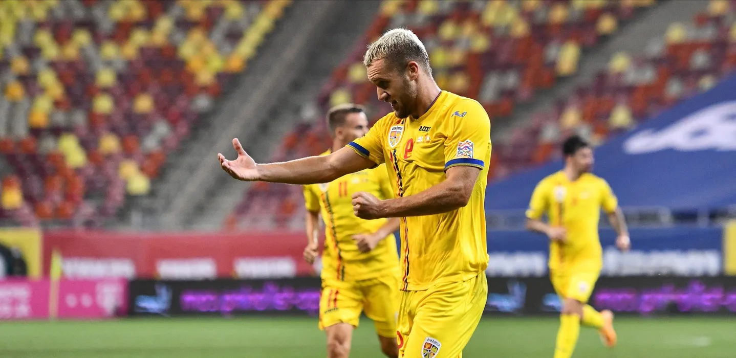 George Puscas se bucura dupa un gol reusit in meciul de fotbal dintre Romania si Irlanda de Nord, contand pentru Liga Natiunilor, desfasurat fara spectatori pe Arena Nationala din Bucuresti, vineri 4 septembrie 2020. © FOTO:Razvan Pasarica/SPORT PICTURES