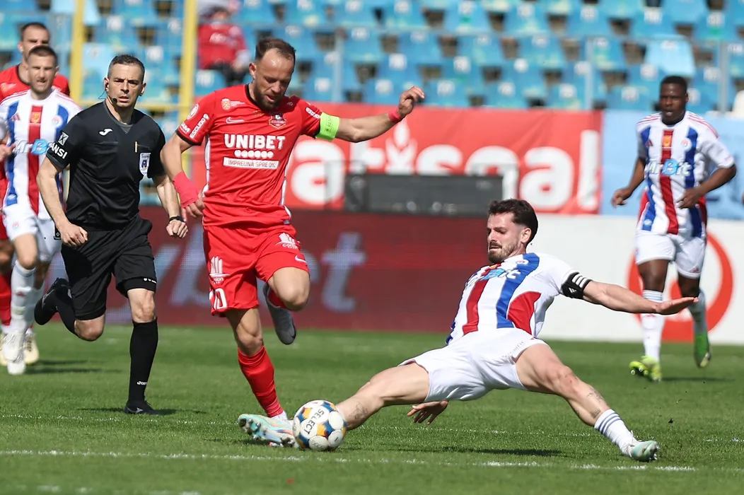 Arbitrul central Florin Andrei urmareste duelul dintre capitanii Cristian Daniel Negut si Joao Pedro Santos Lameira in meciul de fotbal dintre SC Otelul Galati si AFC Hermannstadt, contand pentru Superliga Superbet Play-Out, desfasurat pe Stadionul Otelul din Galati, sambata 4 aprilie 2026. © FOTO:Sorin Pana/SPORT PICTURES