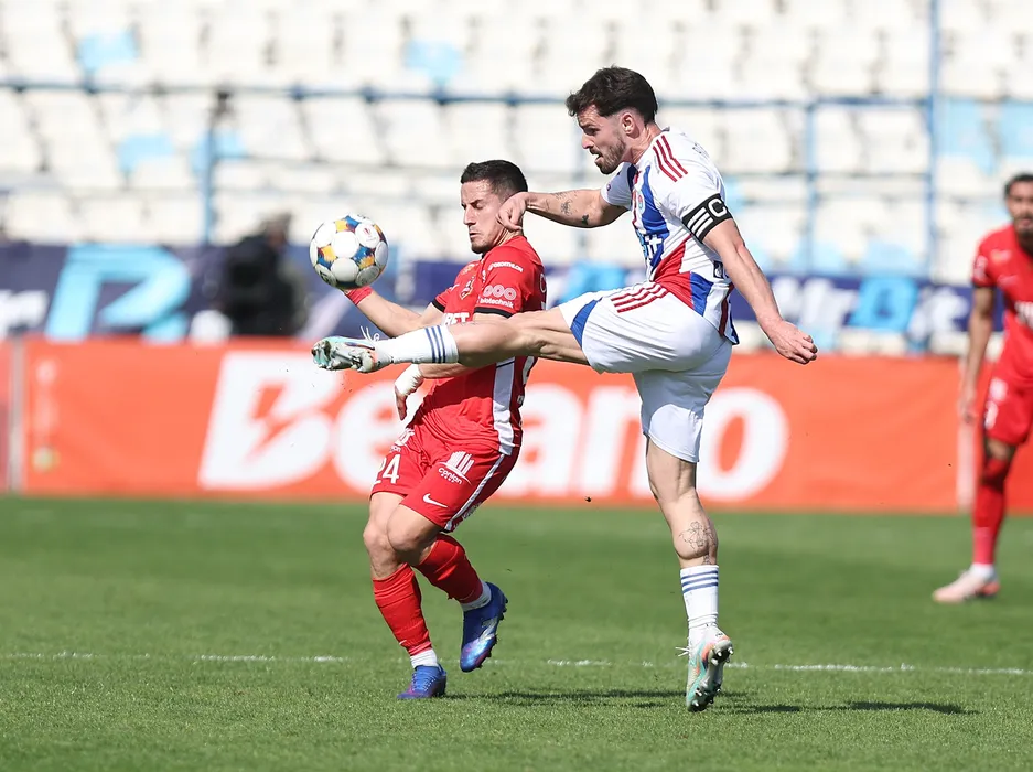 Joao Pedro Santos Lameira si Antoni Valeri Ivanov in meciul de fotbal dintre SC Otelul Galati si AFC Hermannstadt, contand pentru Superliga Superbet Play-Out, desfasurat pe Stadionul Otelul din Galati, sambata 4 aprilie 2026. © FOTO:Sorin Pana/SPORT PICTURES