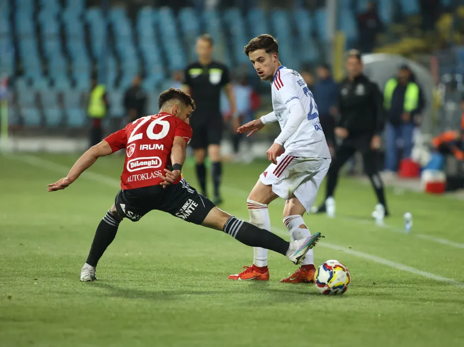 Gabriel Dorinel Oancea și Ștefan Bodișteanu în meciul de fotbal dintre SC Oțelul Galați și FC Uniuversitatea Cluj, contând pentru Cupa României Betano - semifinală, Stadionul Oțelul din Galați, joi 18 aprilie 2024. © FOTO: Sorin PANĂ/SPORT PICTURES