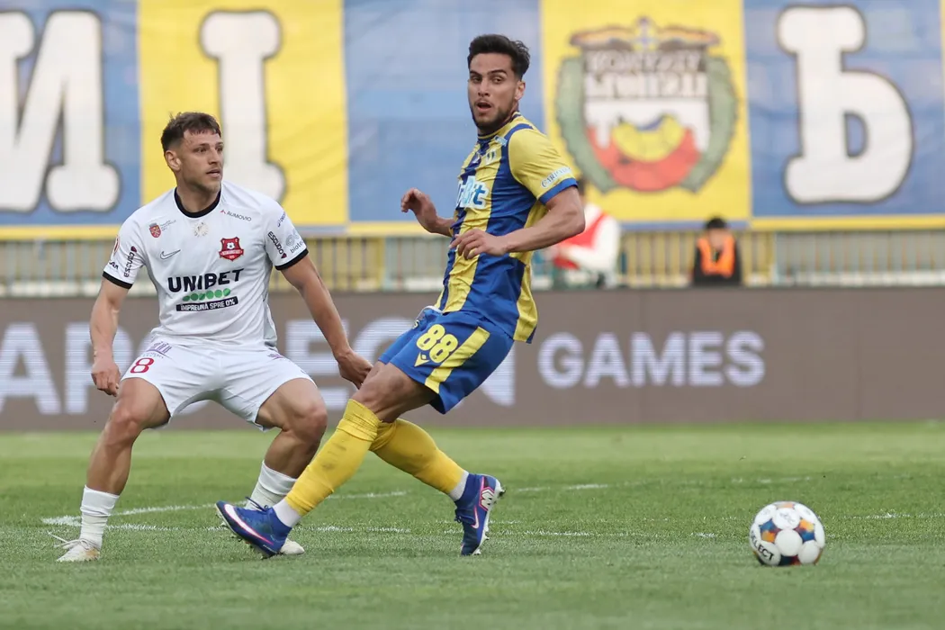 Constantin Dragos Albu si Marco Alexandru Dulca in meciul de fotbal dintre FC Petrolul Ploiesti si AFC Hermannstadt Sibiu, contand pentru Superliga Superbet Play-Out, desfasurat pe Stadionul Ilie Oana din Ploiesti, duminica 19 aprilie 2026. © FOTO:Gheroghe Fluster/SPORT PICTURES