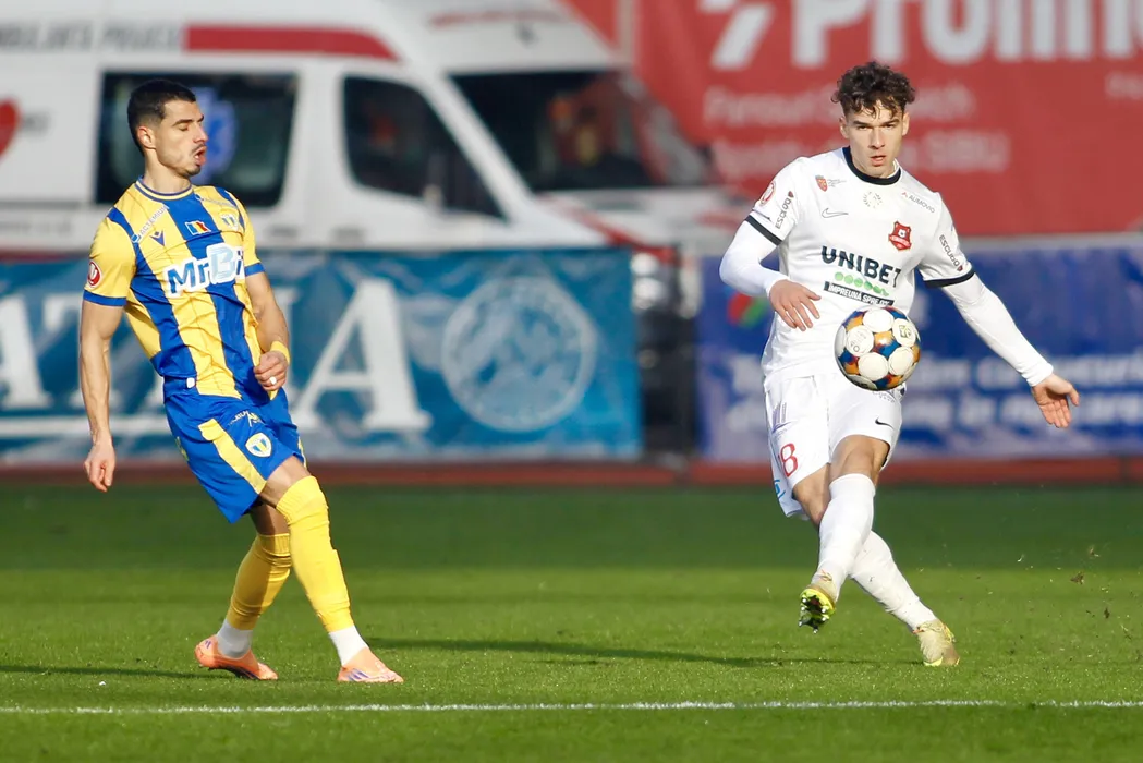 Meciul de fotbal dintre AFC Hermannstdat si FC Petrolul, din etapa a 21-a a Superligii, disputat pe stadionul Municipal din Sibiu, duminica, 21 decembrie 2025. In imagine: Kevin Ciubotaru. OVIDIU MATIU / MEDIAFAX FOTO