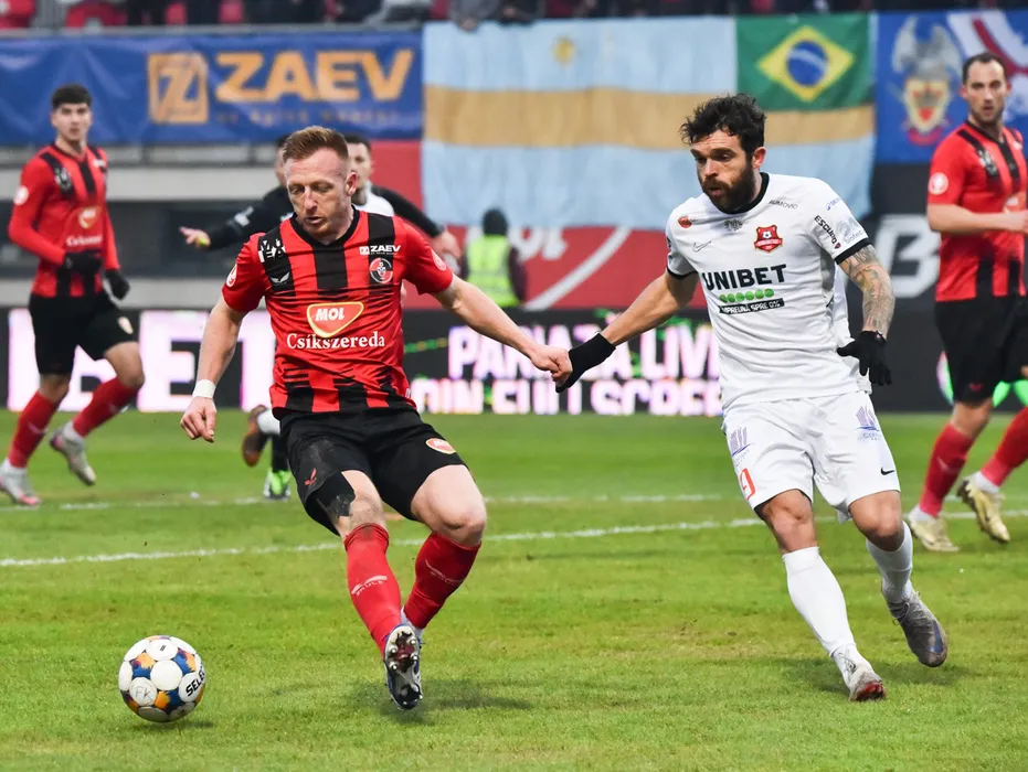Laszlo Kleinheisler si Aurelian Ionut Chitu in meciul de fotbal dintre FK Csikszereda Miercurea Ciuc si AFC Hermannstadt Sibiu, contand pentru Superliga Superbet, desfasurat pe Stadionul Municipal din Miercurea Ciuc, luni 23 februarie 2026. © FOTO:Zoltan Pal/SPORT PICTURES
