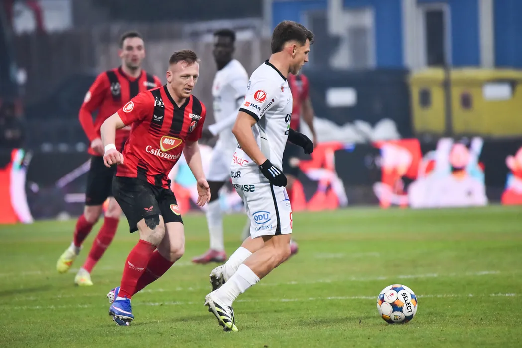 Constantin Dragos Albu si Laszlo Kleinheisler in meciul de fotbal dintre FK Csikszereda Miercurea Ciuc si AFC Hermannstadt Sibiu, contand pentru Superliga Superbet, desfasurat pe Stadionul Municipal din Miercurea Ciuc, luni 23 februarie 2026. © FOTO:Zoltan Pal/SPORT PICTURES