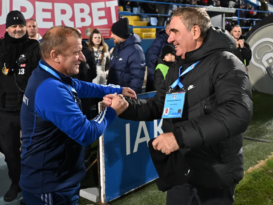Antrenorii celor doua echipe Dorinel Ionel Munteanu si Gheorghe Hagi se saluta inaintea meciului de fotbal dintre Farul Constanta si Otelul Galati, contand pentru Superliga Superbet, desfasurat pe Stadionul central al Academiei Gheorghe Hagi din Ovidiu, vineri 22 noiembrie 2024. © FOTO:Razvan Pasarica/SPORT PICTURES