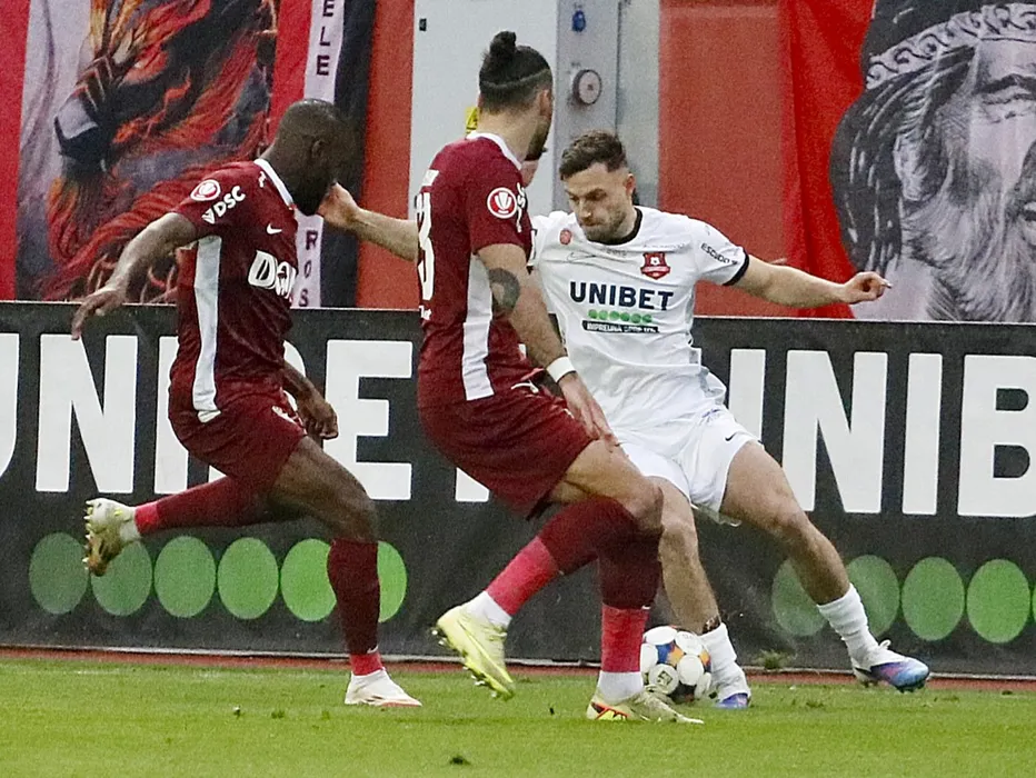 Denis Dorin Politic si Aly Abeid, Karlo Muhar in meciul de fotbal dintre AFC Hermannstadt Sibiu si FC CFR 1907 Cluj, contand pentru Superliga Superbet, desfasurat pe Stadionul Municipal din Sibiu, luni 16 februarie 2026. © FOTO:Valentin Macrea/SPORT PICTURES