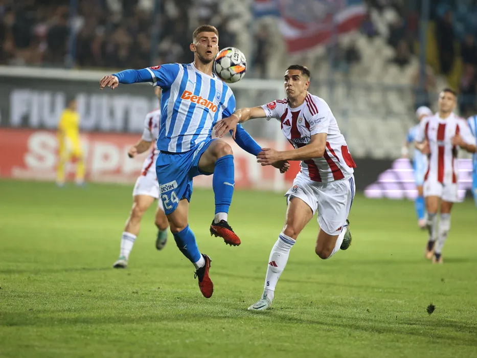 Jovo Lukic și Nikola Stefanovic în meciul de fotbal dintre SC Oțelul Galați si Universitatea Craiova, contând pentru Superliga Superbet, desfășurat pe Stadionul Oțelul din Galați, sâmbătă 5 octombrie 2024. © FOTO: Sorin PANĂ/SPORT PICTURES