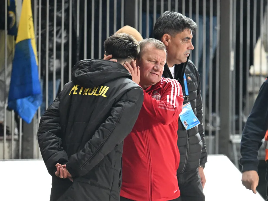 Dorinel Munteanu il saruta pe un copil de mingi dupa ce l-a certat pentru un balon trimis in teren in timpul meciului de fotbal dintre Petrolul Ploiesti si Sepsi OSK Sfantu Gheorghe, din cadrul Play out-ul Superligii Superbet desfasurat pe Stadionul Ilie Oana din Ploiesti, vineri 4 aprilie 2025. © FOTO:Razvan Pasarica/SPORT PICTURES
