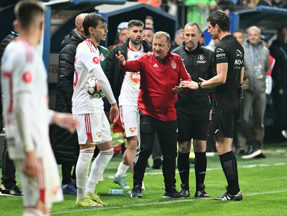 Dorinel Munteanu discută cu arbitrul central Horia Gabriel Mladnovici si arbitrul de rezerva Ionut Coza la meciul de fotbal dintre Petrolul Ploiesti si Sepsi OSK Sfantu Gheorghe, din cadrul Play out-ul Superligii Superbet desfasurat pe Stadionul Ilie Oana din Ploiesti, vineri 4 aprilie 2025. © FOTO:Razvan Pasarica/SPORT PICTURES