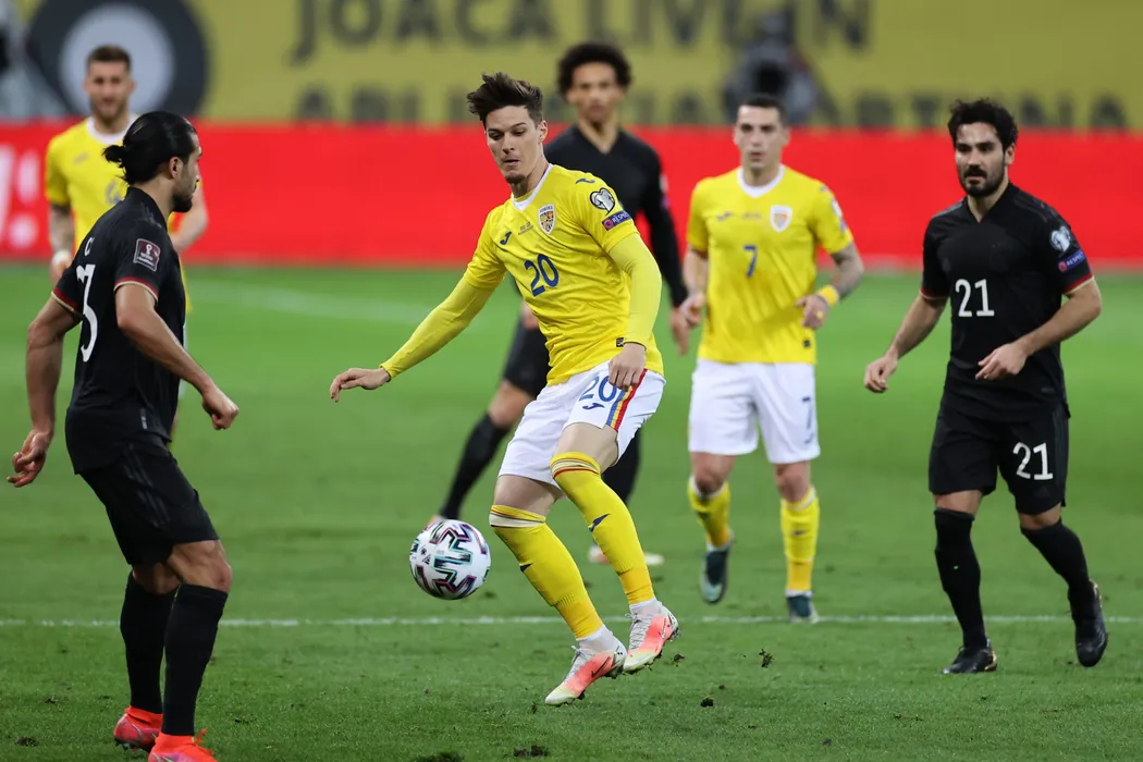 Dennis Man (C), de la nationala de fotbal a Romaniei, suteaza in timpul meciului Romania - Germania din etapa a doua a preliminariilor Campionatului Mondial, disputat pe Arena Nationala din Bucuresti, duminica, 28 martie 2021.