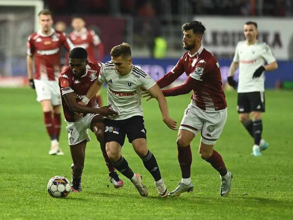 Funsho Ibrahim Bamgboye, Bogdan Ilie Vatajelu si Borja Valle Balonga in meciul de fotbal dintre Rapid Bucuresti si Universitatea Cluj, din cadrul Superligii Superbet, desfasurat pe Superbet Arena-Giulesti din Bucuresti, luni 27 noiembrie 2023. © FOTO:Razvan Pasarica/SPORT PICTURES