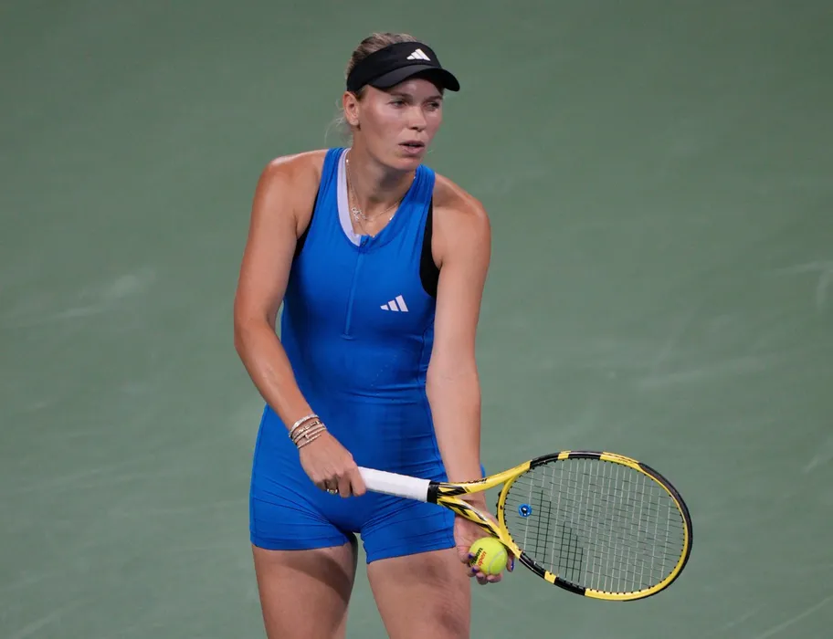 Denmark's Caroline Wozniacki plays her 1st round match in a Blue Catsuit