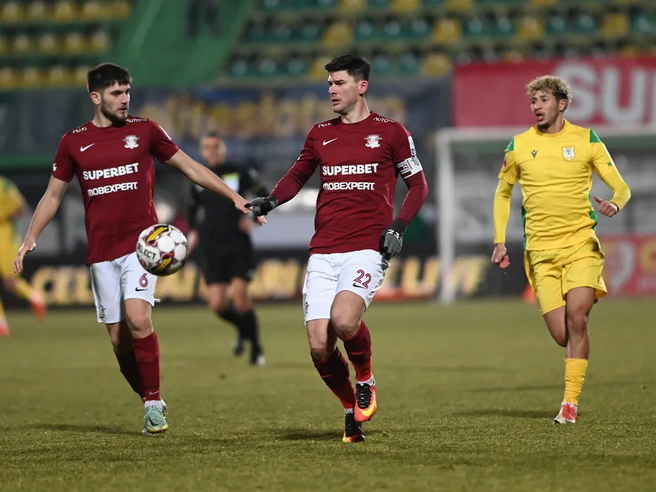 Paul Alexandru Iacob, Cristian Ionut Sapunaru si Amine Benchaib in meciul de fotbal dintre CS Mioveni si Rapid Bucuresti, contand pentru Superliga Superbet, desfasurat pe Stadionul Orasenesc din Mioveni, 17 februarie 2023. © FOTO:Razvan Pasarica/SPORT PICTURES