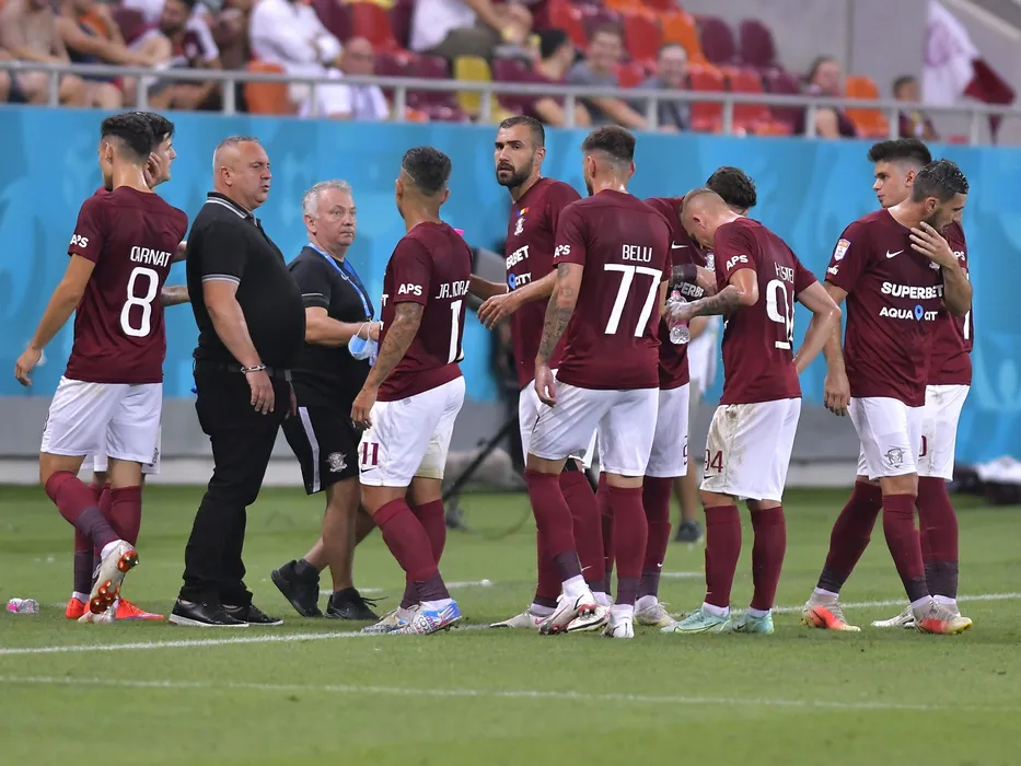 Mihai Iosif alaturi de fotbalistii rapidisti printre care Alexandru Adrian Dandea, Rares Andrei Ilie si Adrian Ionut Balan la o pauza de hidratare la meciul de fotbal dintre Rapid Bucuresti si Farul Constanta, contand pentru Liga 1 Casa Pariurilor, desfasurat pe Arena Nationala din Bucuresti, vineri 30 iulie 2021. © FOTO:Razvan Pasarica/SPORT PICTURES