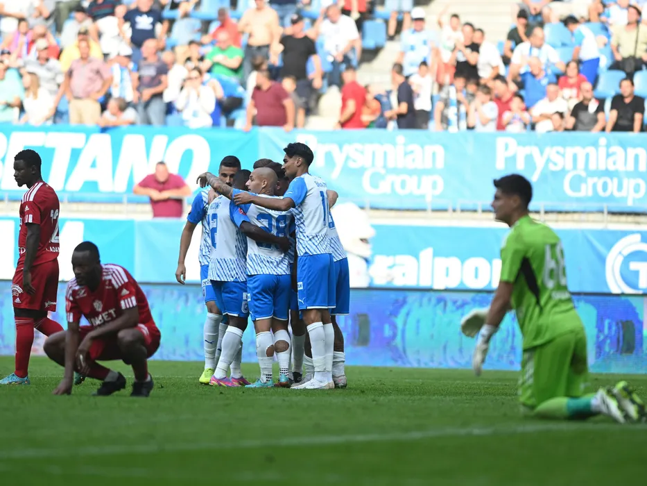 Bucurie a fotbalistilor craioveni dupa un gol marcat cu Screciu Vladimir Ionut, Ionut Alexandru Mitrita si Stefan Baiaram in meciul de fotbal dintre Universitatea Craiova si FC Botosani, contand pentru Superliga Superbet, desfasurat pe Stadionul Ion Oblemenco din Craiova, duminica 1 octombrie 2023. © FOTO:Razvan Pasarica/SPORT PICTURES