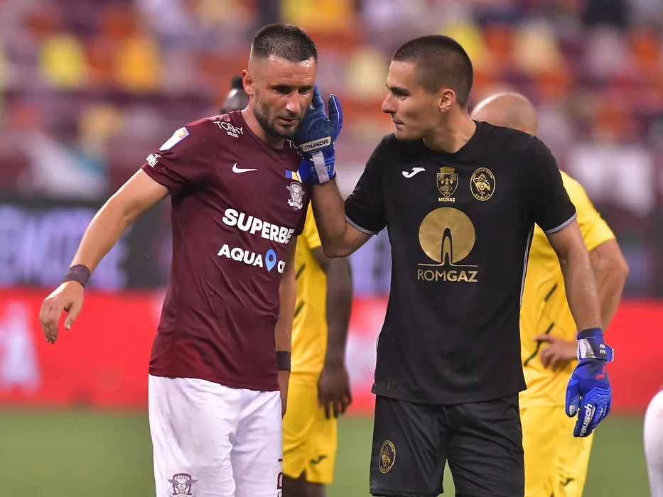 Dragos Grigore si Octavian Gabriel Valceanu discuta dupa meciul de fotbal dintre Rapid Bucuresti si Gaz Metan Medias, contand pentru Liga 1 Casa Pariurilor, desfasurat pe Arena Nationala din Bucuresti, vineri 17 septembrie 2021. © FOTO:Razvan Pasarica/SPORT PICTURES