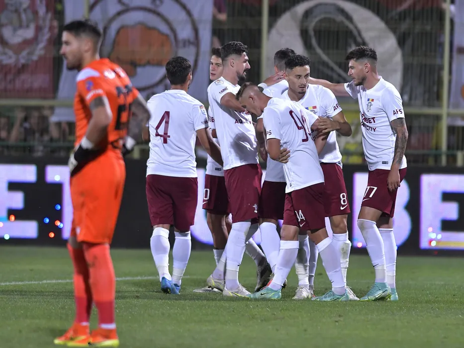 Bucurie a fotbalistilor rapidisti dupa un gol marcat cu Alexandru Cristian Albu, Catalin Florin Hlistei, Nicolae Carnat si Claudiu Belu Iordache in meciul de fotbal dintre CS Mioveni si Rapid Bucuresti, contand pentru Liga 1 Casa Pariurilor, desfasurat pe Stadionul Orasenesc din Mioveni, sambata 23 iulie 2021. © FOTO:Razvan Pasarica/SPORT PICTURES