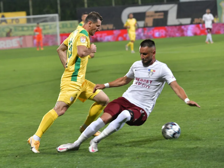 Miluta Stefan Blanaru si Dragos Grigore in meciul de fotbal dintre CS Mioveni si Rapid Bucuresti, contand pentru Liga 1 Casa Pariurilor, desfasurat pe Stadionul Orasenesc din Mioveni, sambata 23 iulie 2021. © FOTO:Razvan Pasarica/SPORT PICTURES