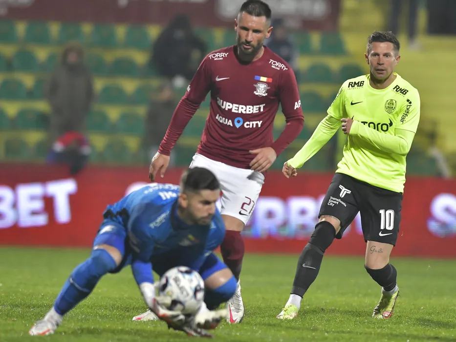 Dragos Grigore si Ciprian Ioan Deac in meciul de fotbal dintre Rapid Bucuresti si CFR Cluj, contand pentru Liga 1 Casa Pariurilor, desfasurat pe Stadionul Orasenesc din Mioveni, duminica 17 octombrie 2021. © FOTO:Razvan Pasarica/SPORT PICTURES