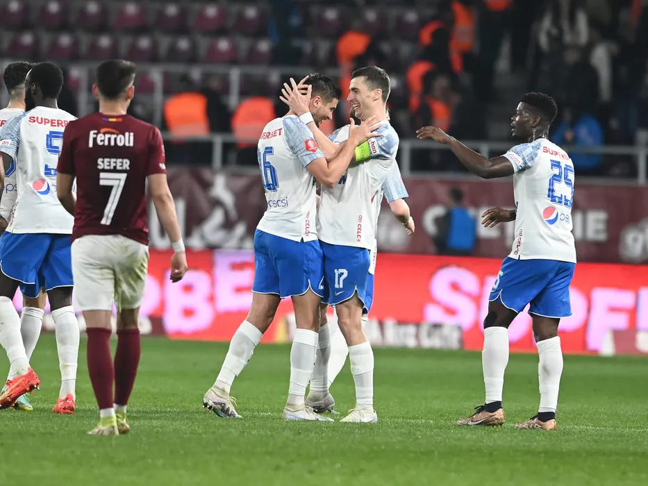 Enagnon David Kiki si Ionut Justinian Larie il felicita pe Dragos Ionut Nedelcu dupa un gol marcat in meciul de fotbal dintre Rapid Bucuresti si Farul Constanta, contand pentru Play-off-ul Superligii Superbet, desfasurat pe Stadionul Rapid Giulesti din Bucuresti, sambata 1 aprilie 2023. © FOTO:Razvan Pasarica/SPORT PICTURES