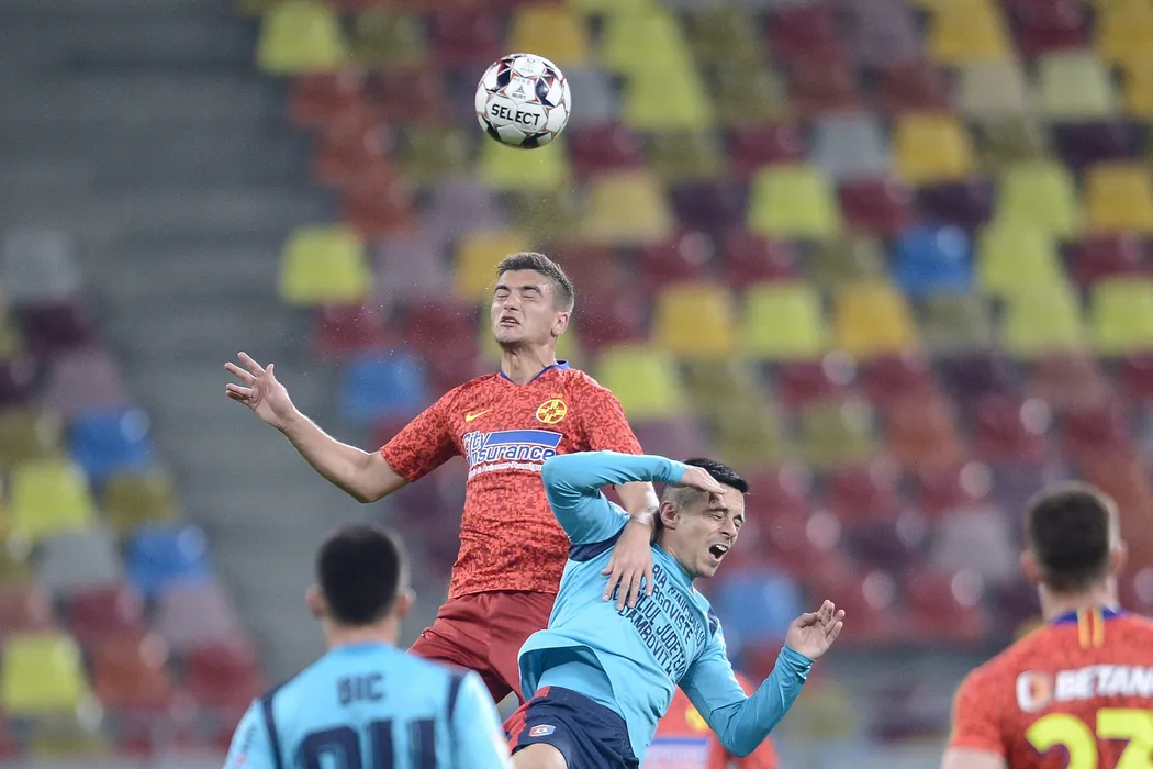 Dragos Nedelcu (S), de la FCSB, lupta pentru posesia balonului, in timpul meciului de fotbal contra echipei Chindia Targoviste din etapa 26 a Ligii 1, disputat Arena Nationala din Bucuresti, sambata, 22 februarie 2020. ALEXANDRU DOBRE / MEDIAFAX FOTO
