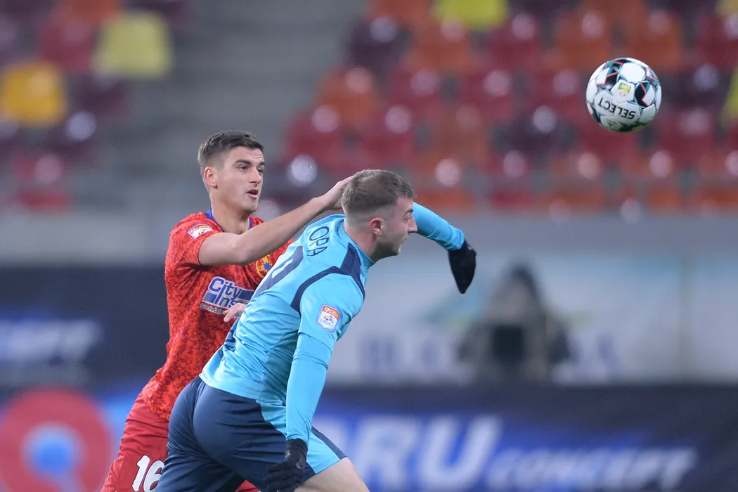 Dragos Nedelcu (S), de la FCSB, lupta pentru balon cu Daniel Popa (D), de la Chindia Targoviste, in meciul de fotbal din etapa a XXIV-a a Ligii 1, disputat pe Arena Nationala din Bucuresti, sambata, 20 februarie 2021. ALEXANDRU DOBRE / MEDIAFAX FOTO