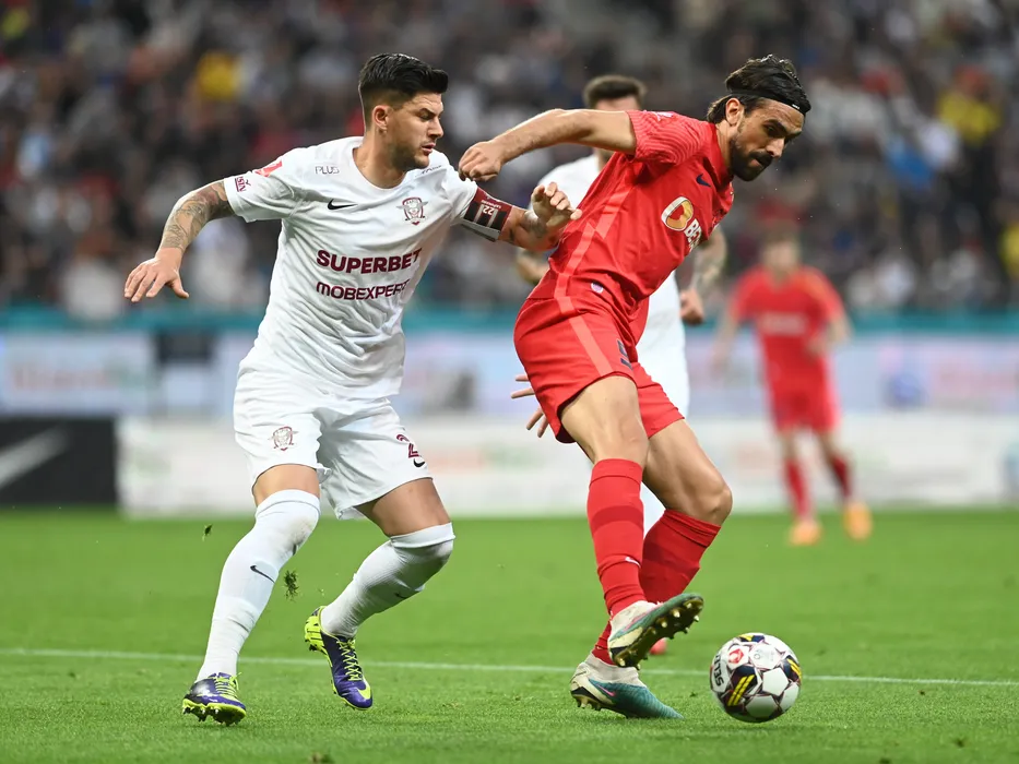 Cristian Ionut Sapunaru si Andrea Compagno in meciul de fotbal dintre FCSB si Rapid Bucuresti, contand pentru Play-off-ul Superligii Superbet, desfasurat pe Arena Nationala din Bucuresti, sambata 27 mai 2023. © FOTO:Razvan Pasarica/SPORT PICTURES