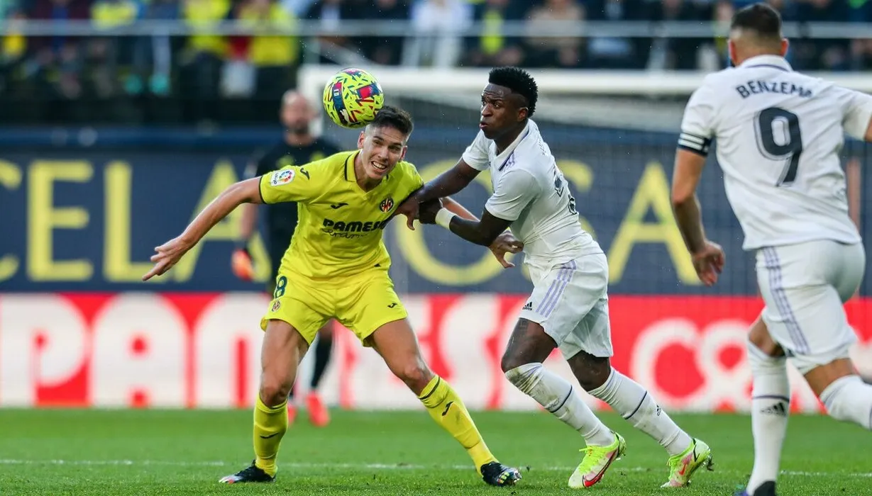 Juan Foyth of Villarreal and Vinicius Junior of Real Madrid in action during the Santander League match between Villareal CF and Real Madrid at the La Ceramica Stadium on January 7, 2023, in Castellon, Spain.