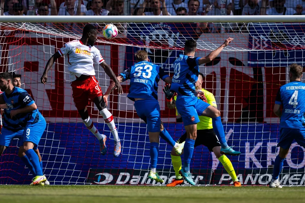 28 May 2023, Bavaria, Regensburg: Soccer: 2. Bundesliga, Jahn Regensburg - 1. FC Heidenheim, Matchday 34, Jahnstadion Regensburg. Regensburg's Prince Owusu scores the goal to make it 1:0. Photo: Tom Weller/dpa - IMPORTANT NOTE: In accordance with the requirements of the DFL Deutsche Fußball Liga and the DFB Deutscher Fußball-Bund, it is prohibited to use or have used photographs taken in the stadium and/or of the match in the form of sequence pictures and/or video-like photo series.,Image: 779890135, License: Rights-managed, Restrictions: , Model Release: no