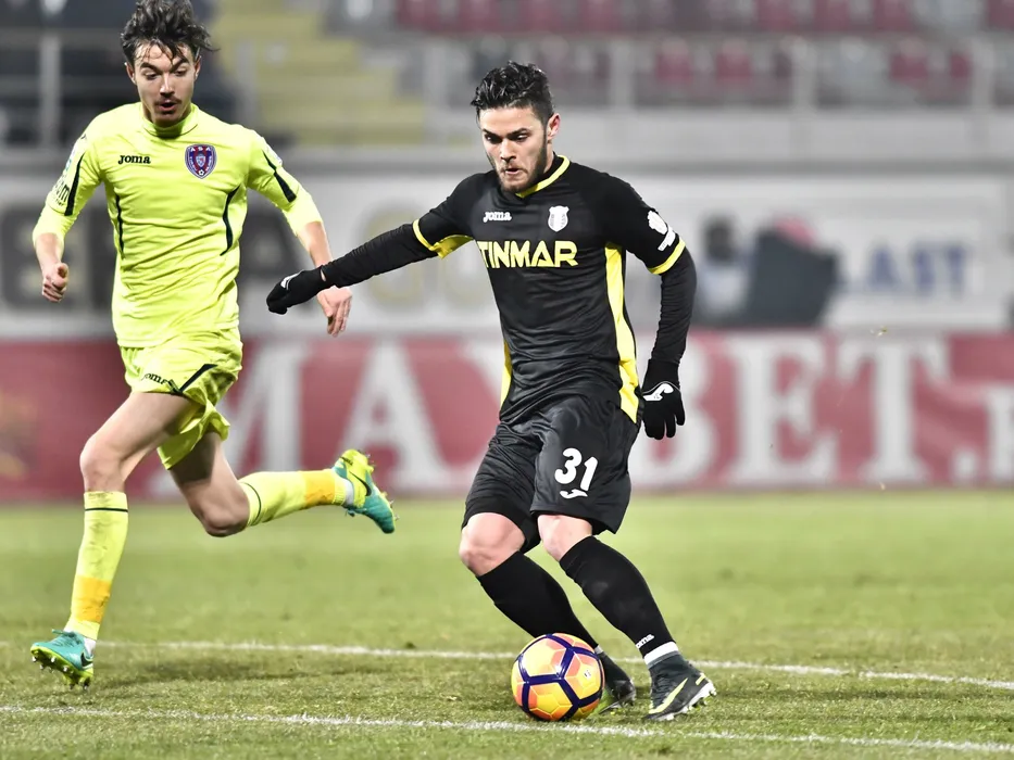 Robert Candrea (S) si Alexandru Ionita (D) se lupta pentru balon in meciul de fotbal dintre Astra Giurgiu si ASA Targu Mures, din etapa a XXII-a a Ligii 1 Orange, disputat pe stadionul Marin Anastasovici din Giurgiu, 3 februarie 2017. Razvan Pasarica/ Sport Pictures
