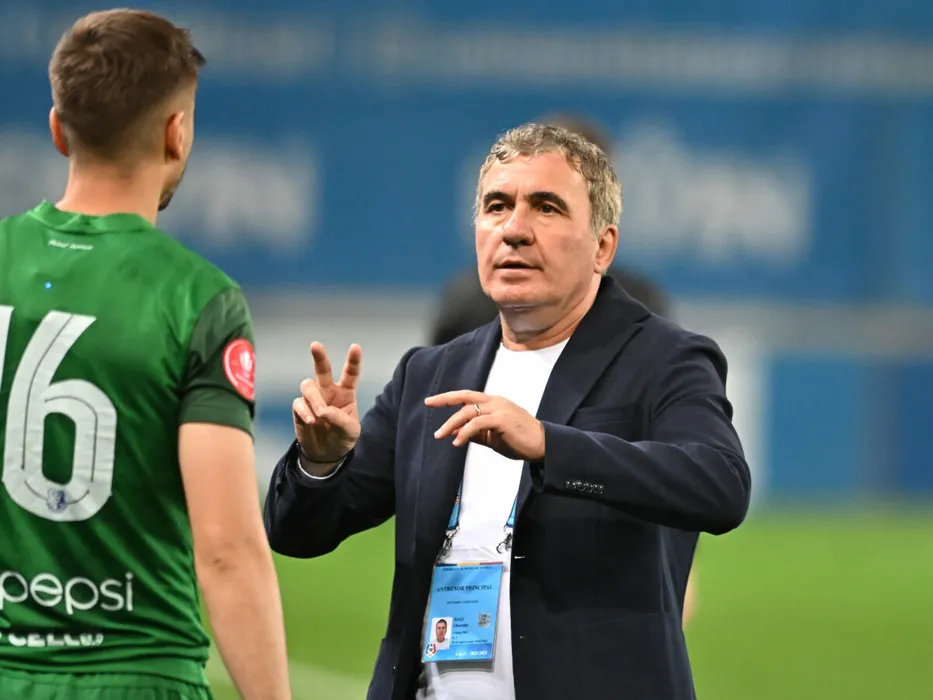 Gheorghe Hagi discuta cu Dragoș Ionuț Nedelcu în meciul de fotbal dintre Universitatea Craiova si Farul Constanta, contând pentru Play off-ul Superligii Superbet, desfășurat pe Stadionul Ion Oblemenco din Craiova, vineri 12 aprilie 2024. © FOTO: Răzvan PĂSĂRICĂ/SPORT PICTURES