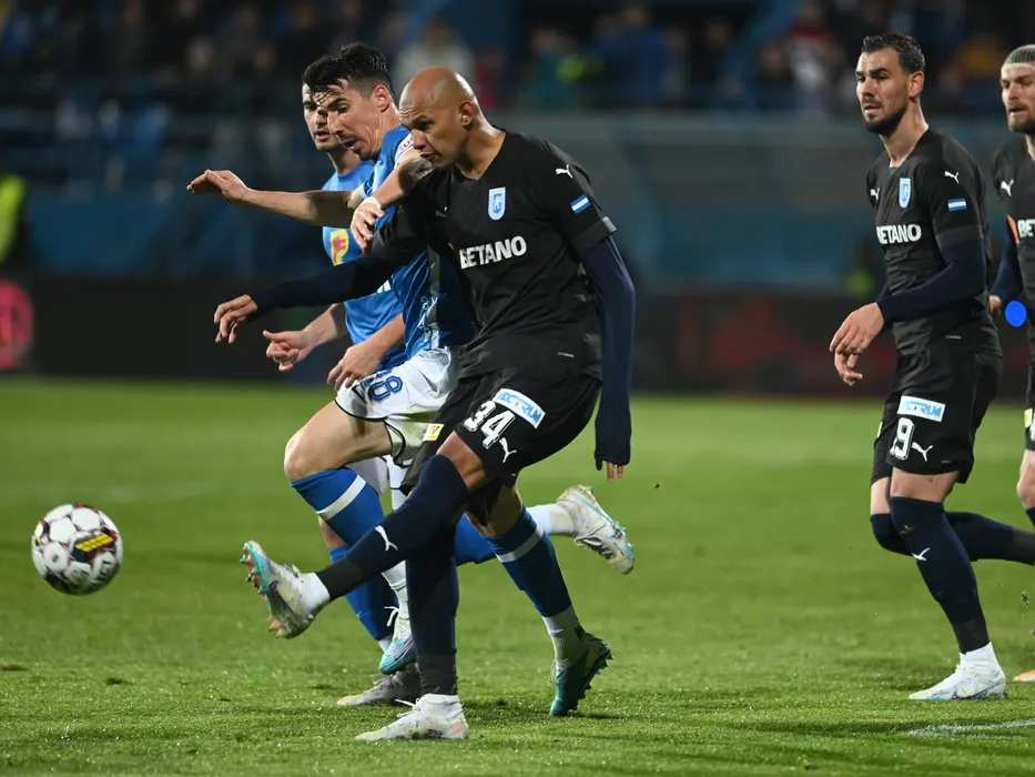 Ionut Justinian Larie, Raul Michel Melo Da Silva si Elvir Koljic in meciul de fotbal dintre Farul Constanta si Universitatea Craiova, contand pentru Play-off-ul Superligii Superbet, desfasurat pe Stadionul central al Academiei Gheorghe Hagi din Ovidiu, sambata 8 aprilie 2023. © FOTO:Razvan Pasarica/SPORT PICTURES